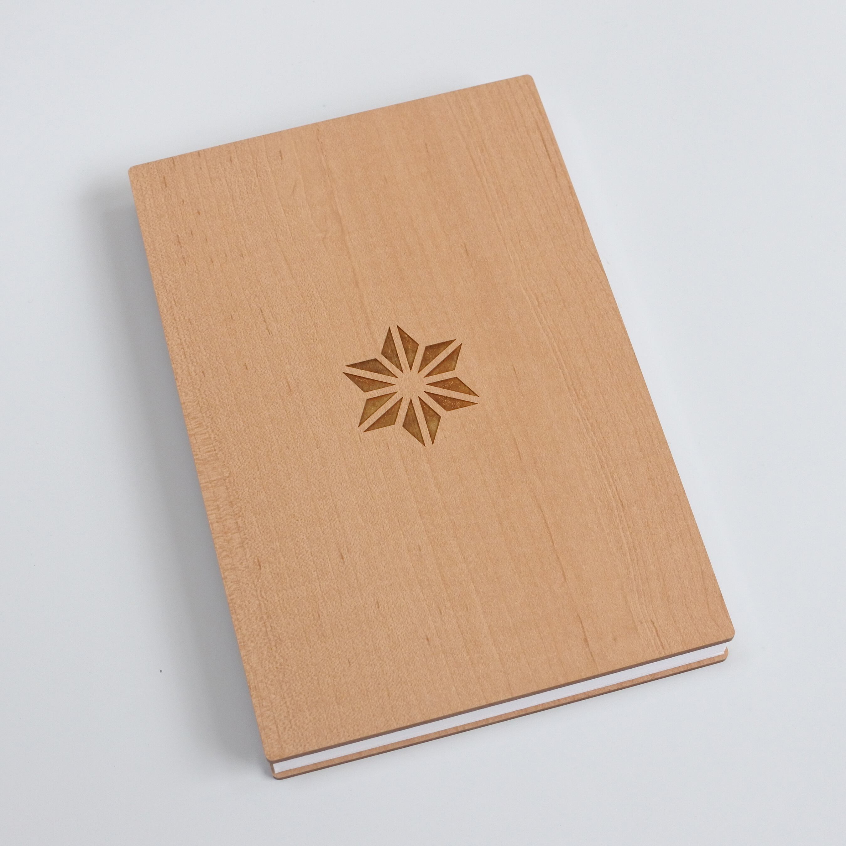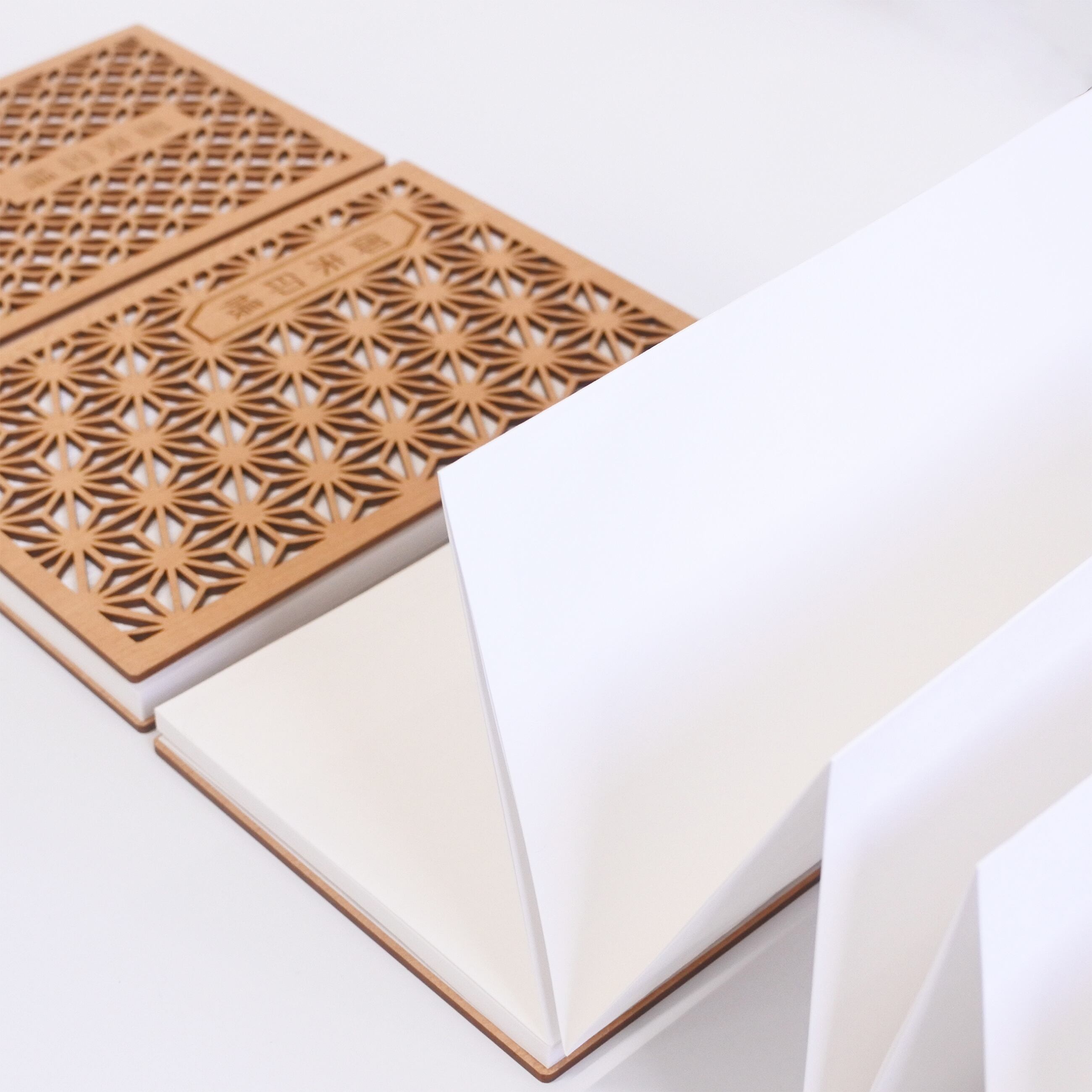 レーザー加工を施した木材(MDF)の表紙は、温もりを感じられる風合いで、手にしっとりと馴染みます。