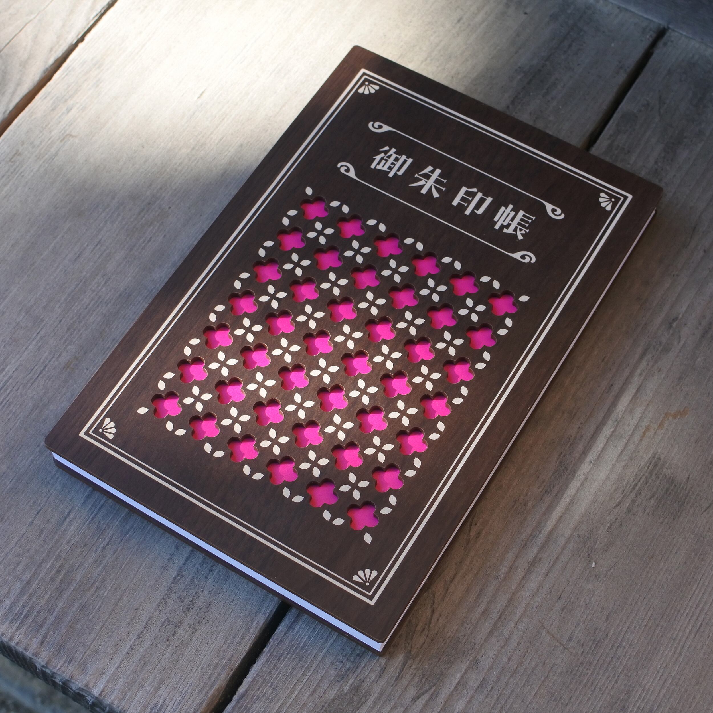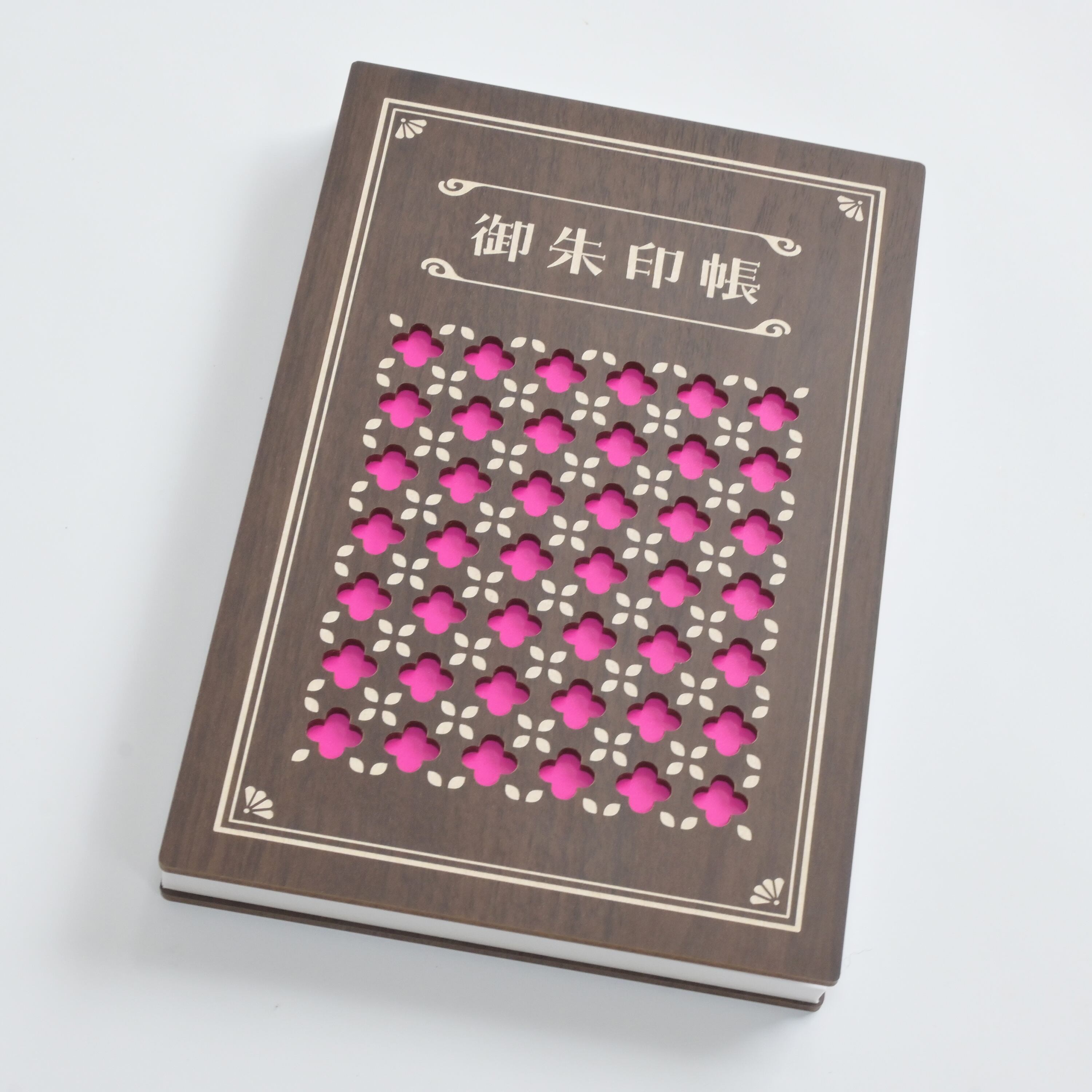 レトロで愛らしい「キッサ」は、小さなお花がちりばめられたデザイン。大正・昭和の喫茶店のようなぬくもりを感じさせます。MDF材のやさしい風合いとレーザー加工の繊細な模様が、御朱印帳にふんわりとした上品さをプラス。