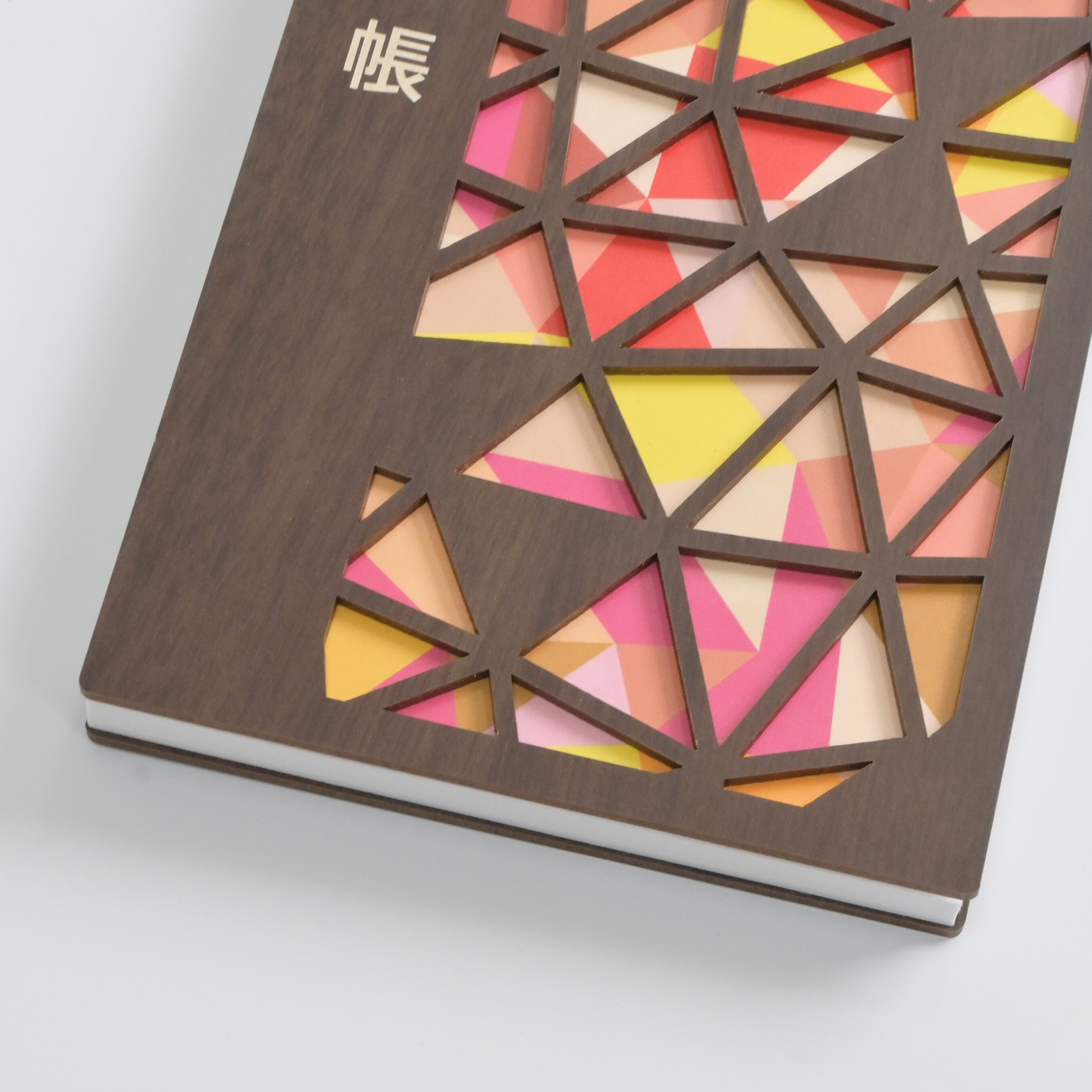 レーザー加工を施した木材(MDF)の表紙は、温もりを感じられる風合いで、手にしっとりと馴染みます。
