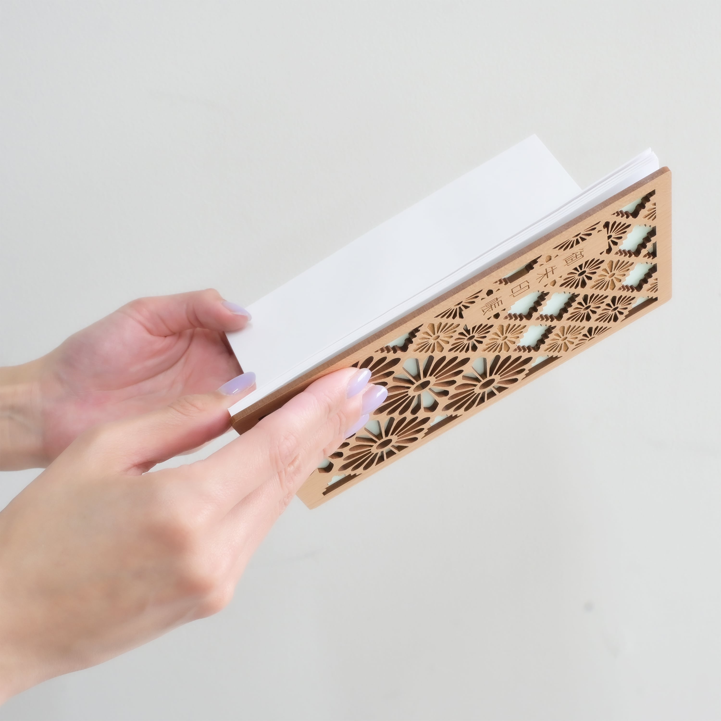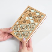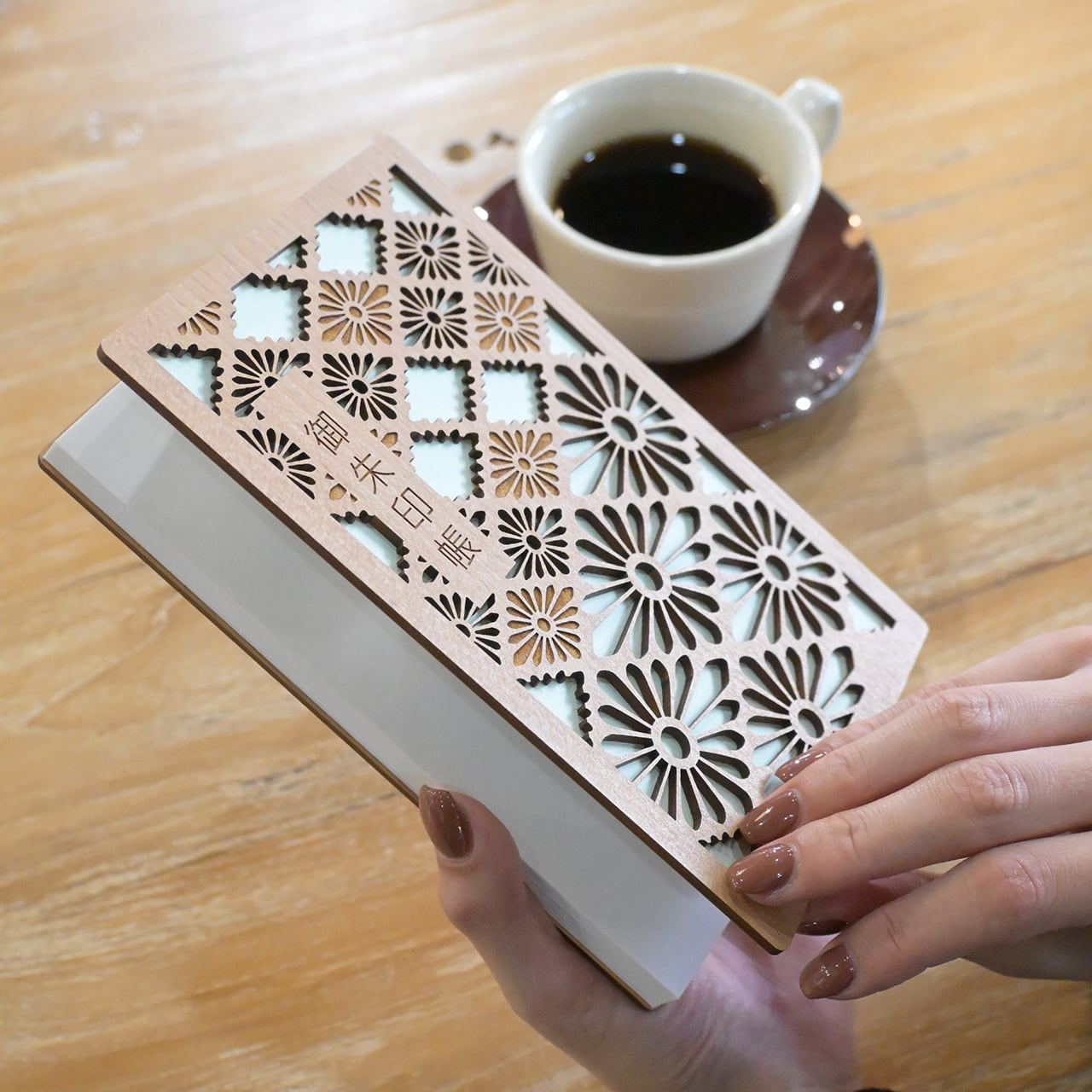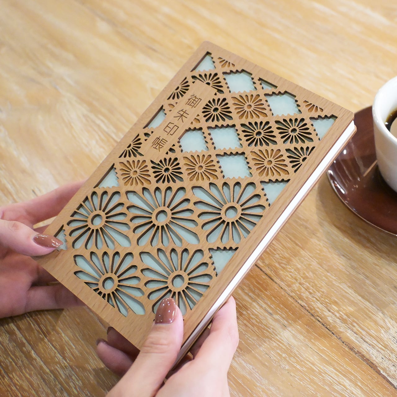 レーザー加工を施した木材(MDF)の表紙は、温もりを感じられる風合いで、手にしっとりと馴染みます。
