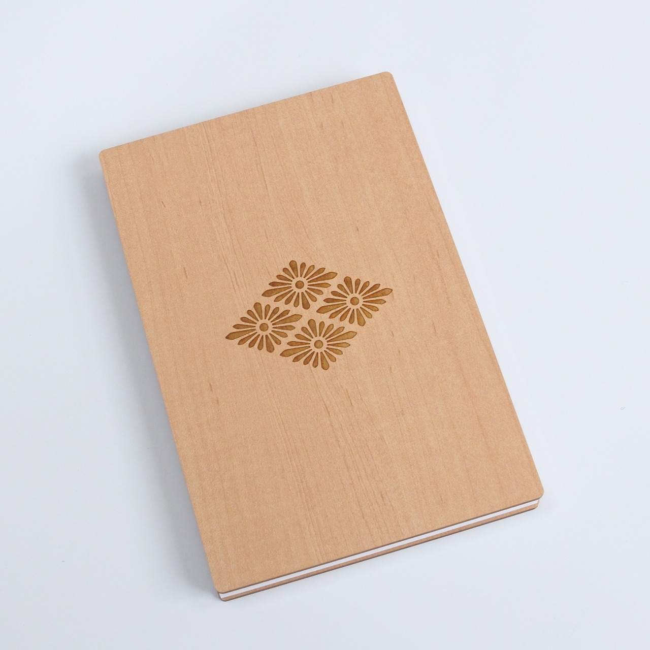 菊の花をモダンにアレンジしたデザインが、落ち着きのある色合いと美しく調和し、幅広いシーンで楽しめます。温かみのある木の質感で、使うたびに心が豊かになる一冊。和風すぎない上品さを求める方や、特別なデザインを探している方にぴったりです。