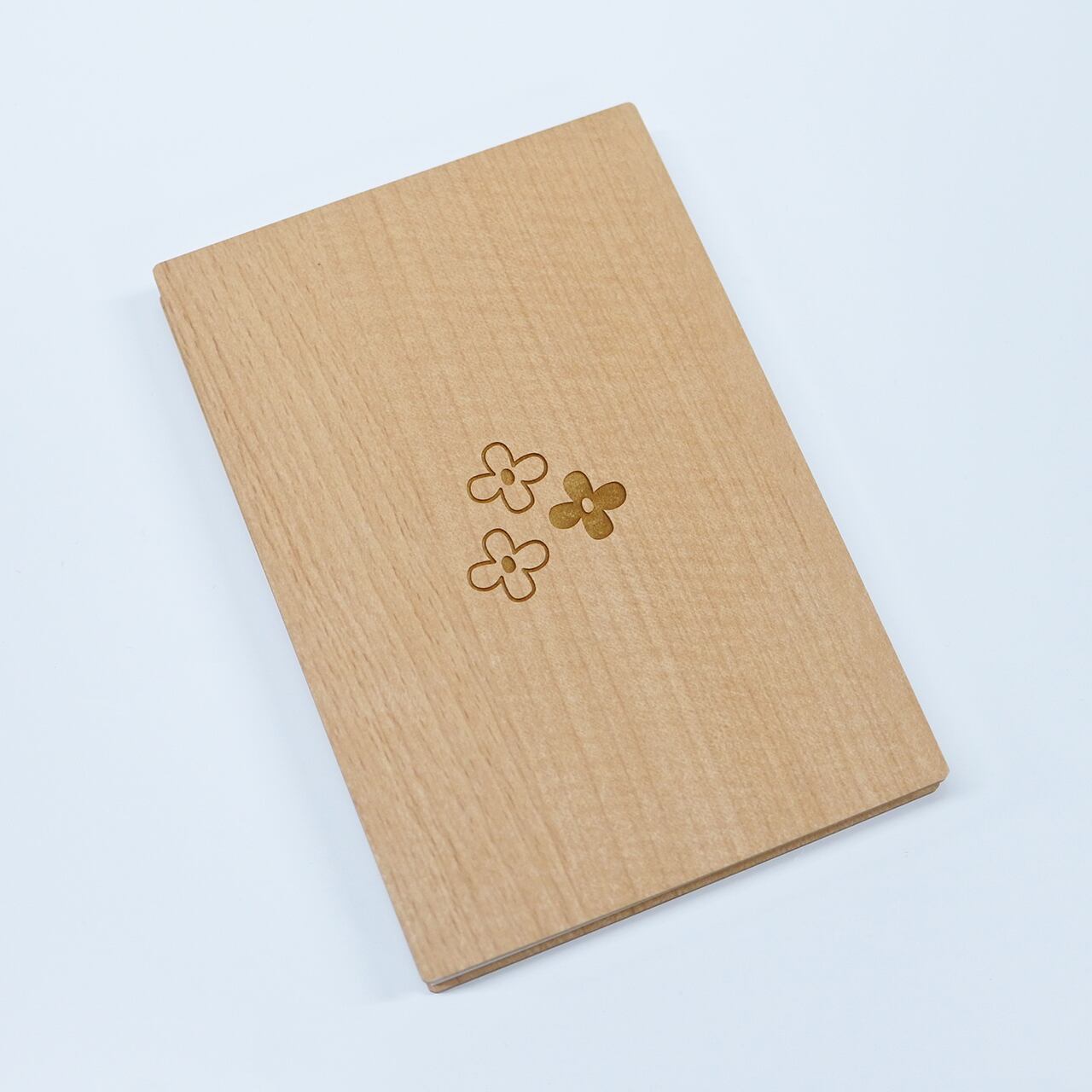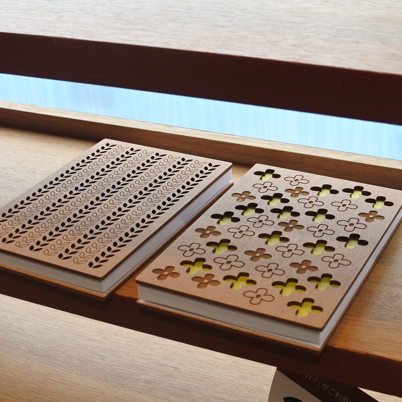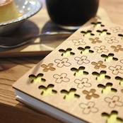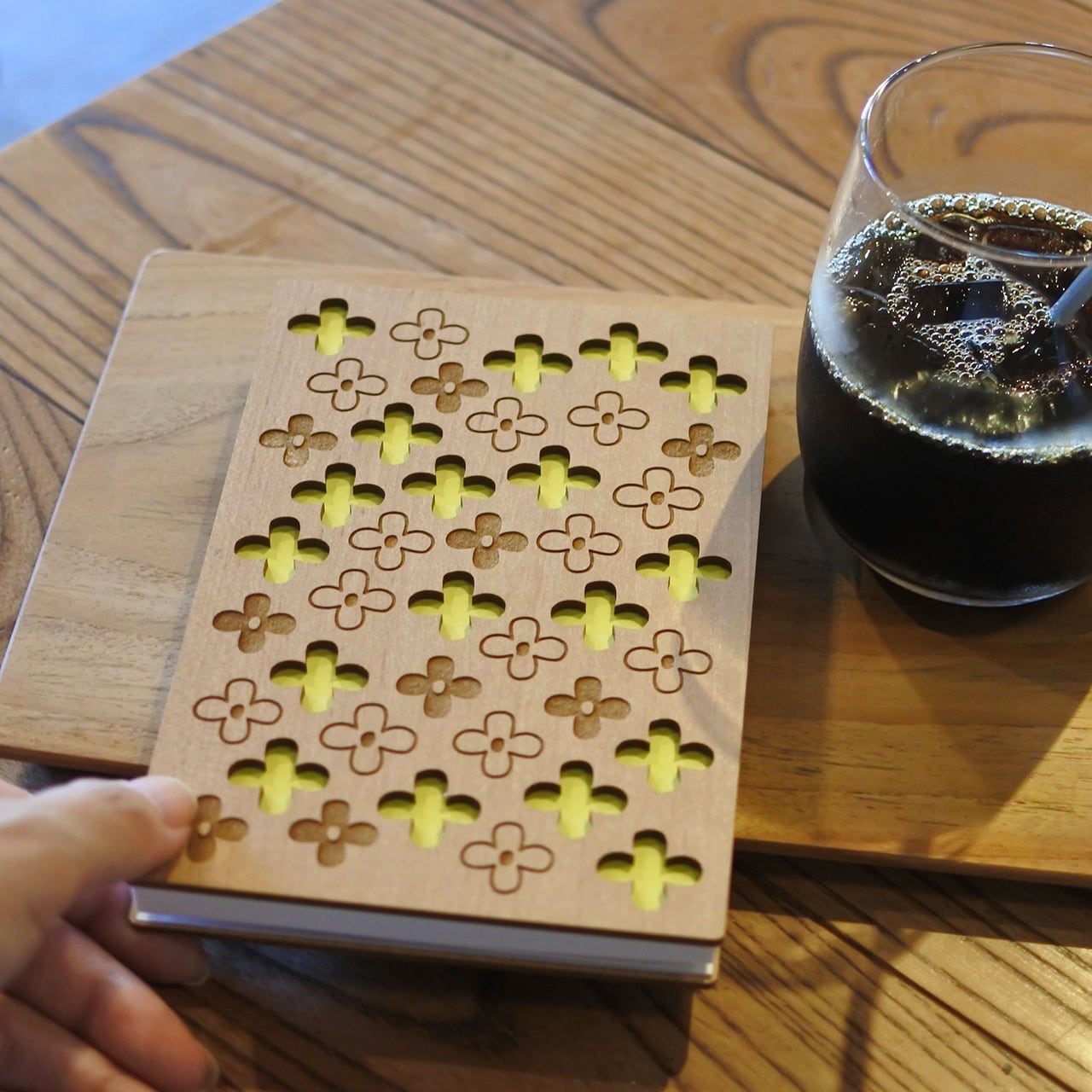 レーザー加工を施した木材(MDF)の表紙は、温もりを感じられる風合いで、手にしっとりと馴染みます。