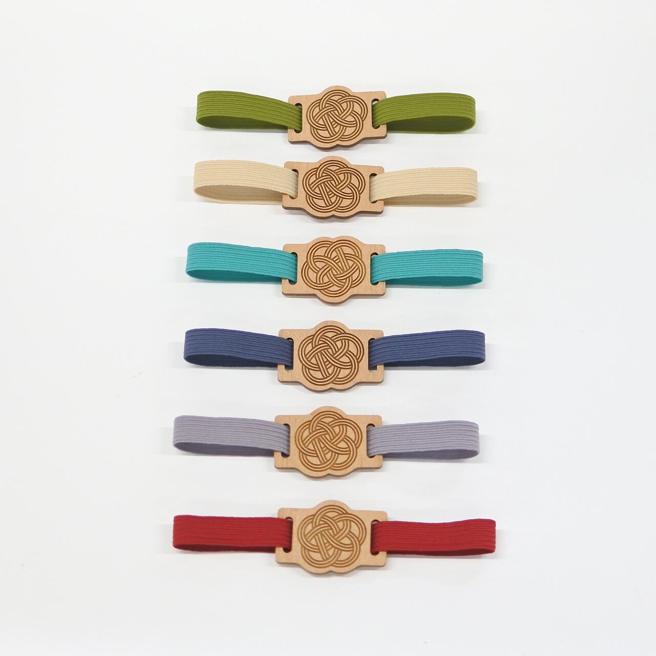 本体はレーザー加工を施した木材(MDF)を使用し、温かみのある質感と耐久性を兼ね備えています。ゴムはライクラ®ファイバーのカラーゴムを使用。しっかりフィットしながらも柔らかく、長く使っても伸びにくいです。