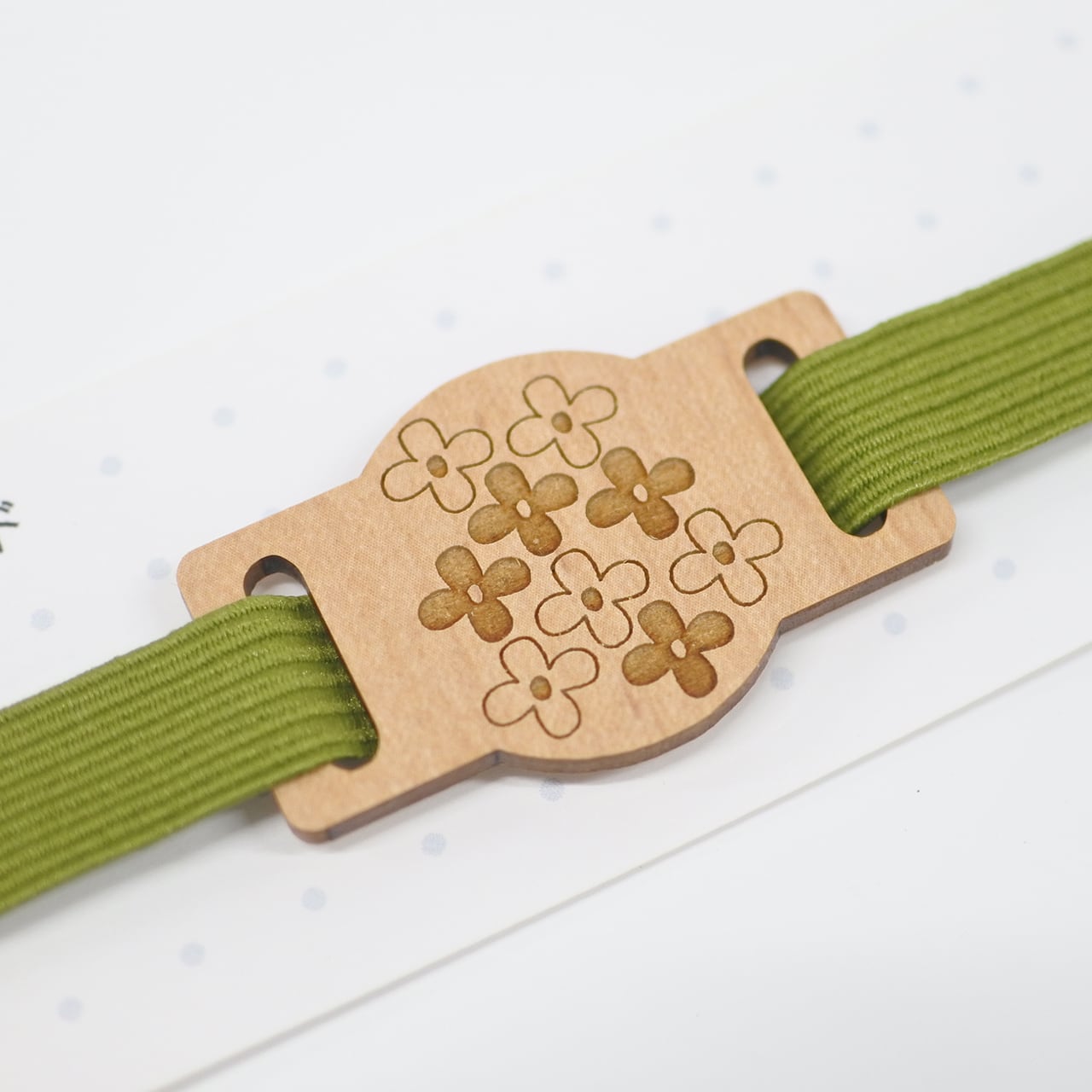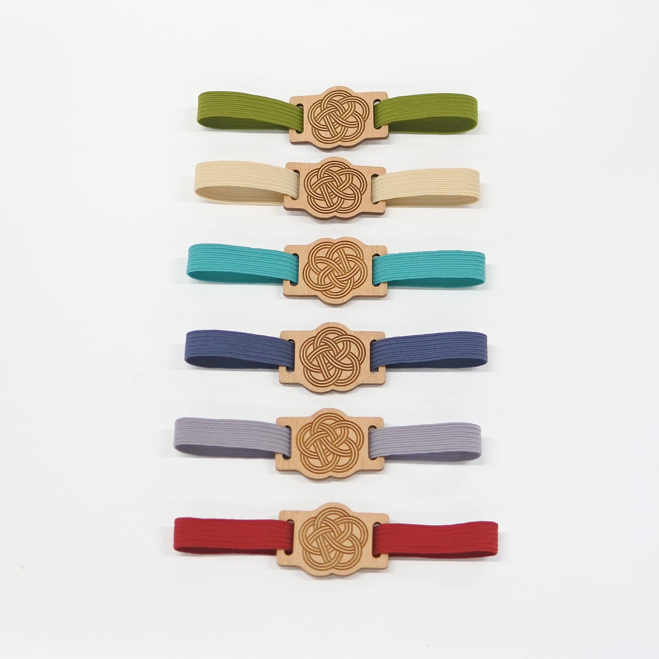 本体はレーザー加工を施した木材(MDF)を使用し、温かみのある質感と耐久性を兼ね備えています。ゴムはライクラ®ファイバーのカラーゴムを使用。しっかりフィットしながらも柔らかく、長く使っても伸びにくいです。