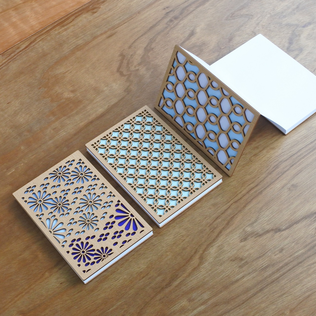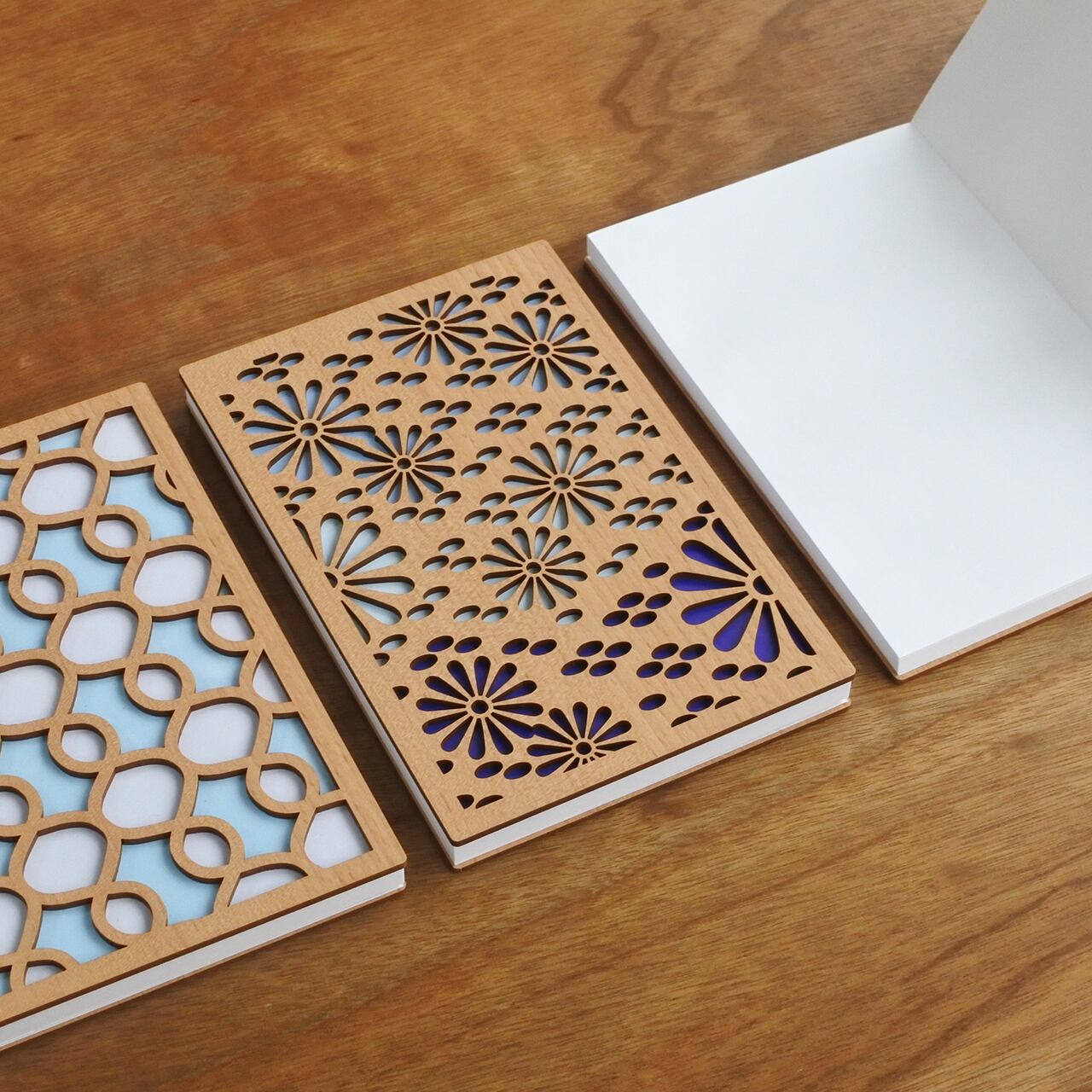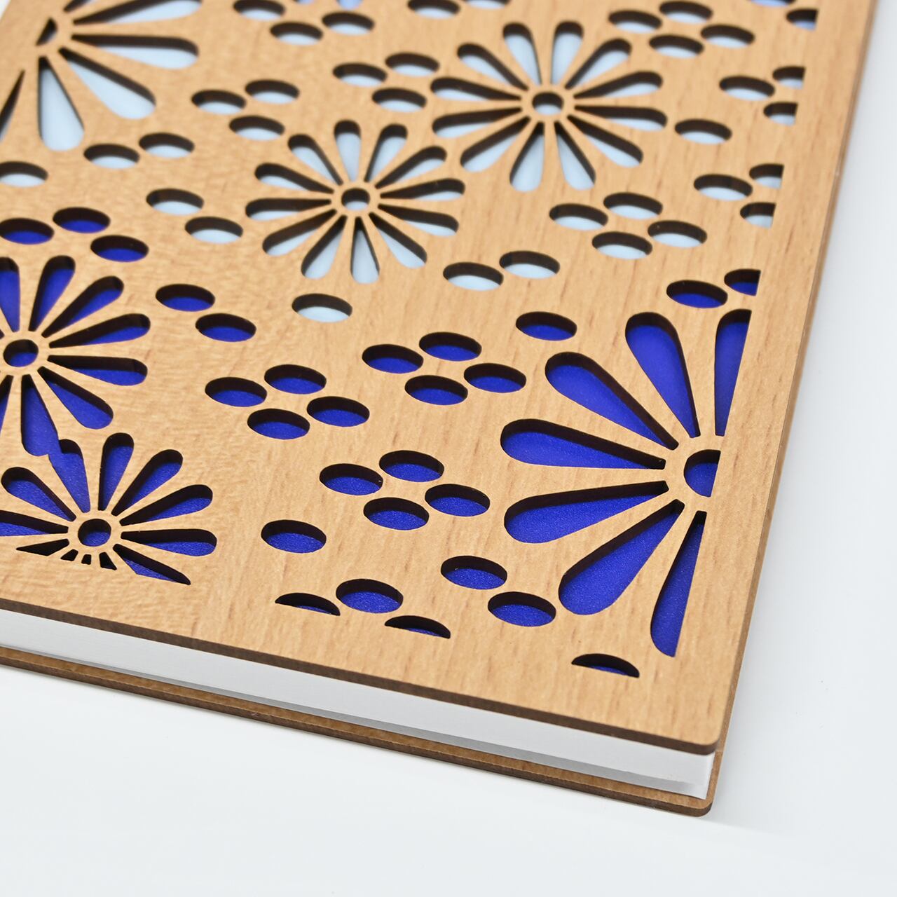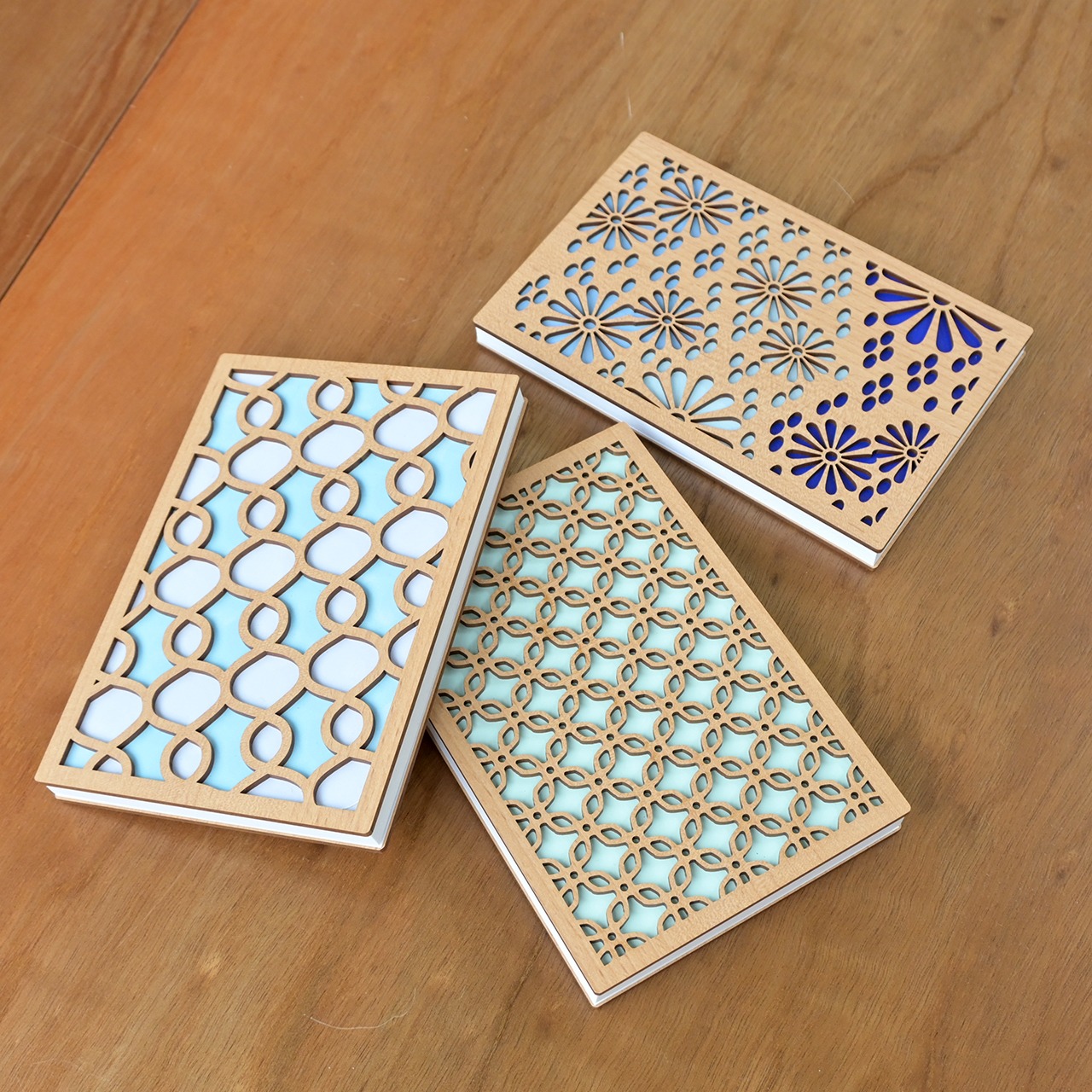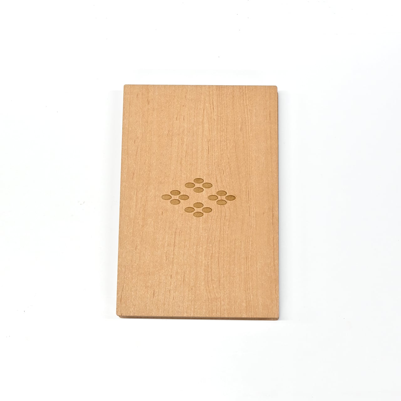 レーザー加工を施した木材(MDF)の表紙は、温もりを感じられる風合いで、手にしっとりと馴染みます。