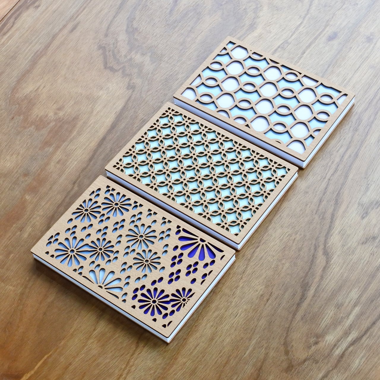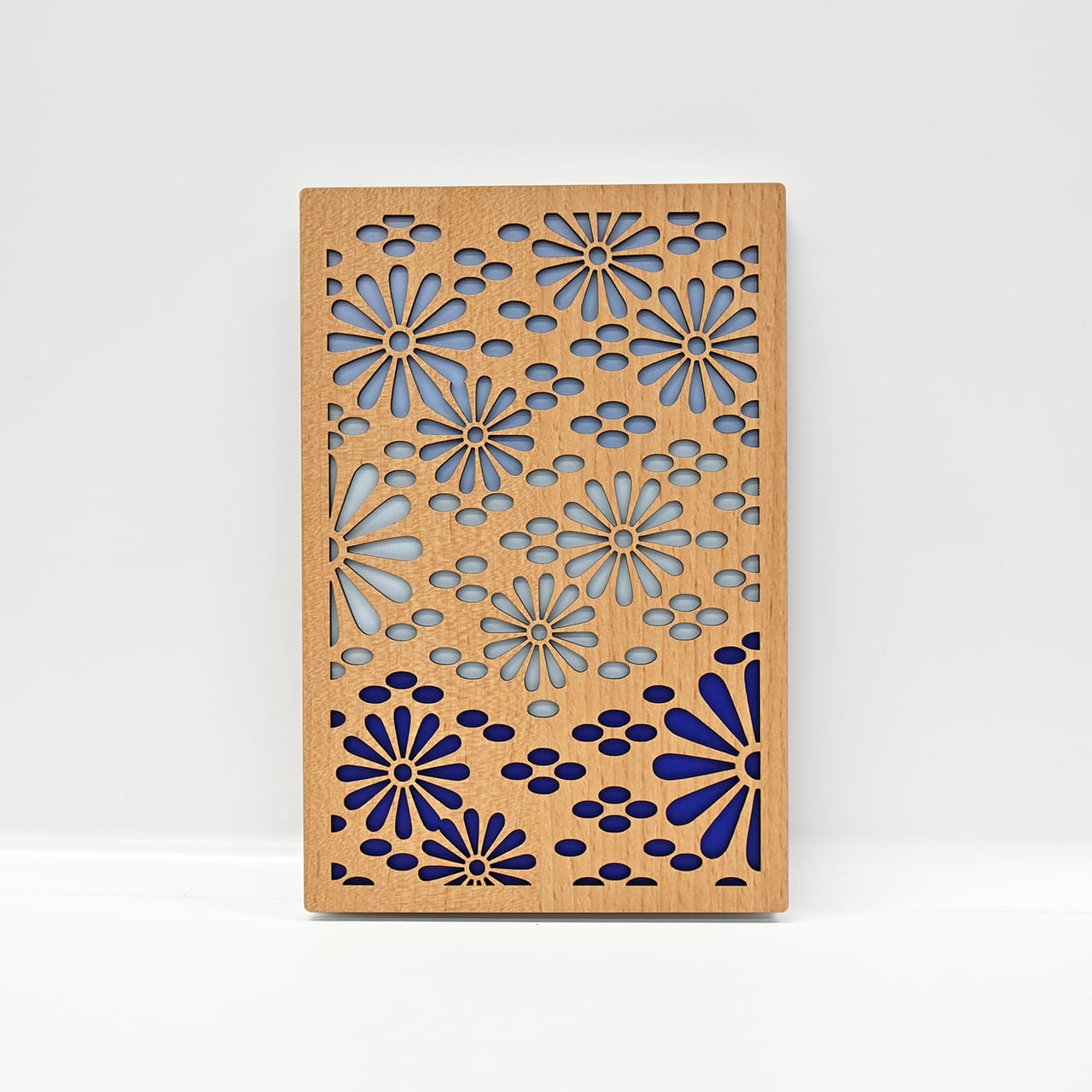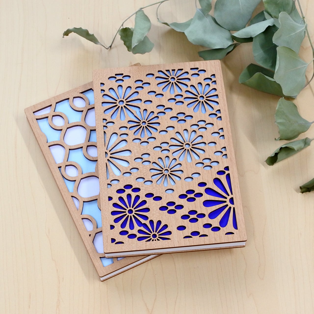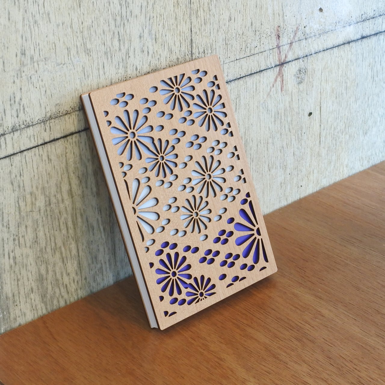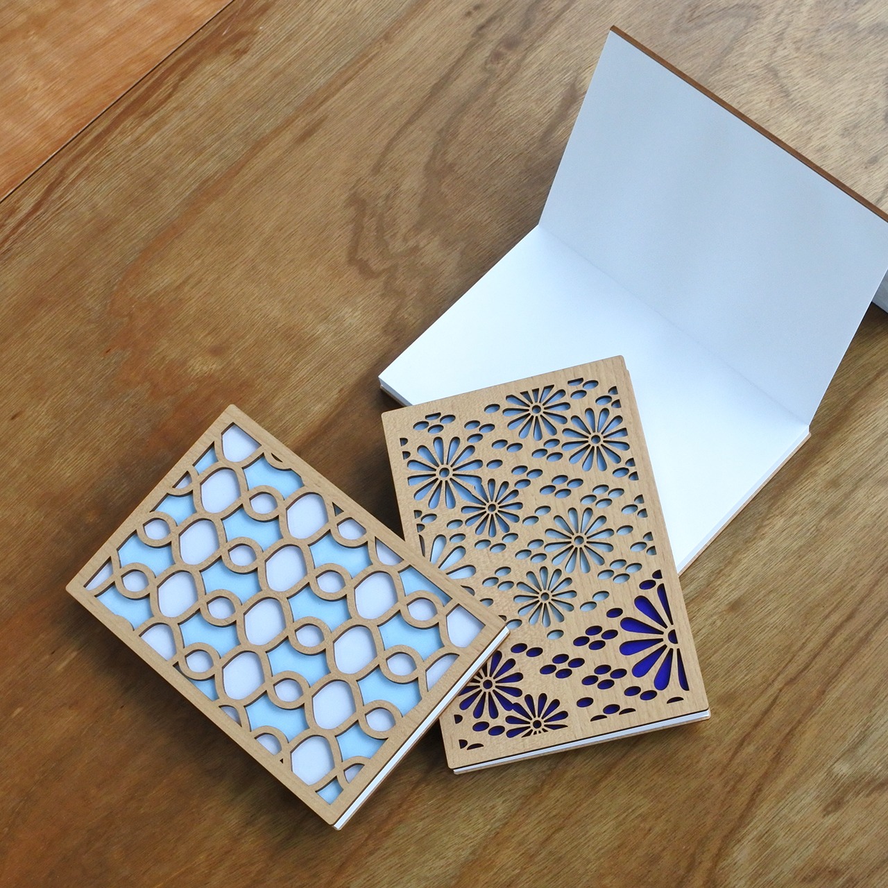 レーザー加工を施した木材(MDF)の表紙は、温もりを感じられる風合いで、手にしっとりと馴染みます。