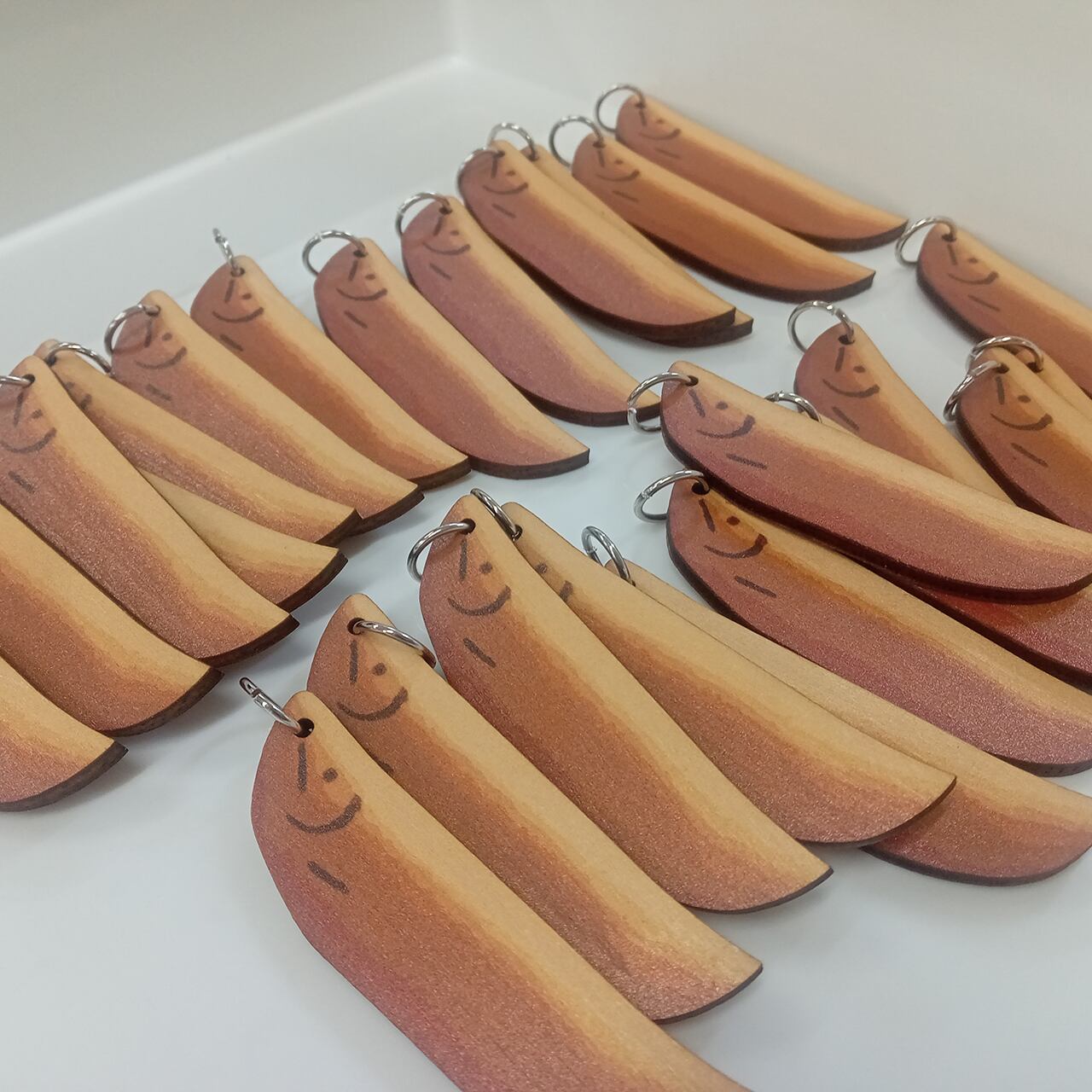 岐阜・長良川の夏の風物詩「鵜飼(うかい)」——雅やかな風景とともに親しまれてきた、やさしい和菓子「鮎菓子」。その姿を合板にリアルにプリントした木製キーホルダーを作りました。