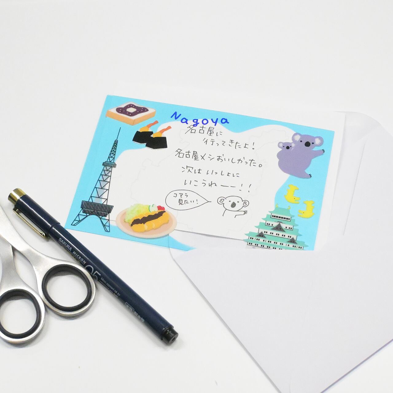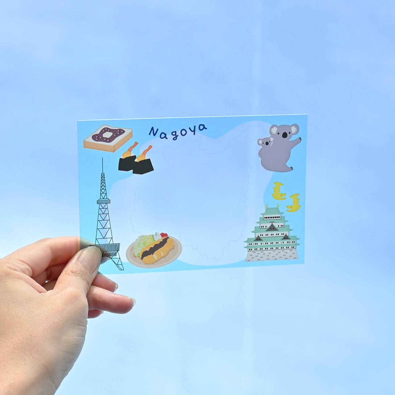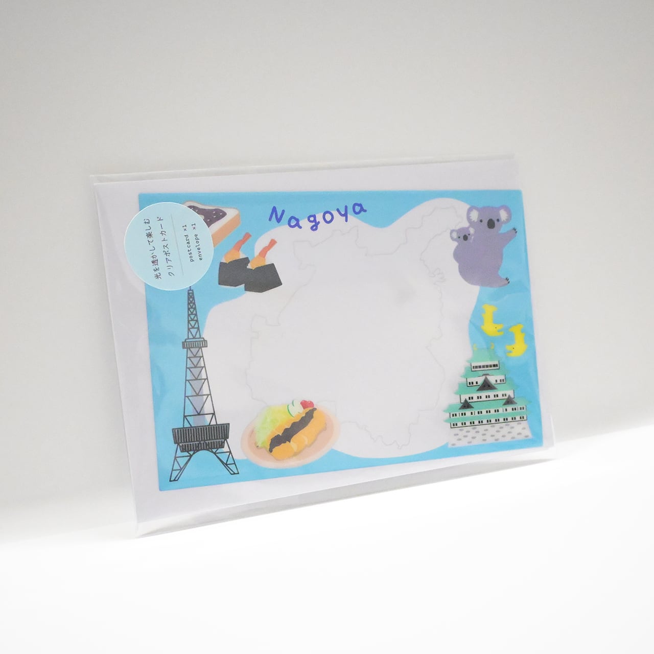 名古屋の名物や名所を、透明フィルムに印刷したポストカードセット。