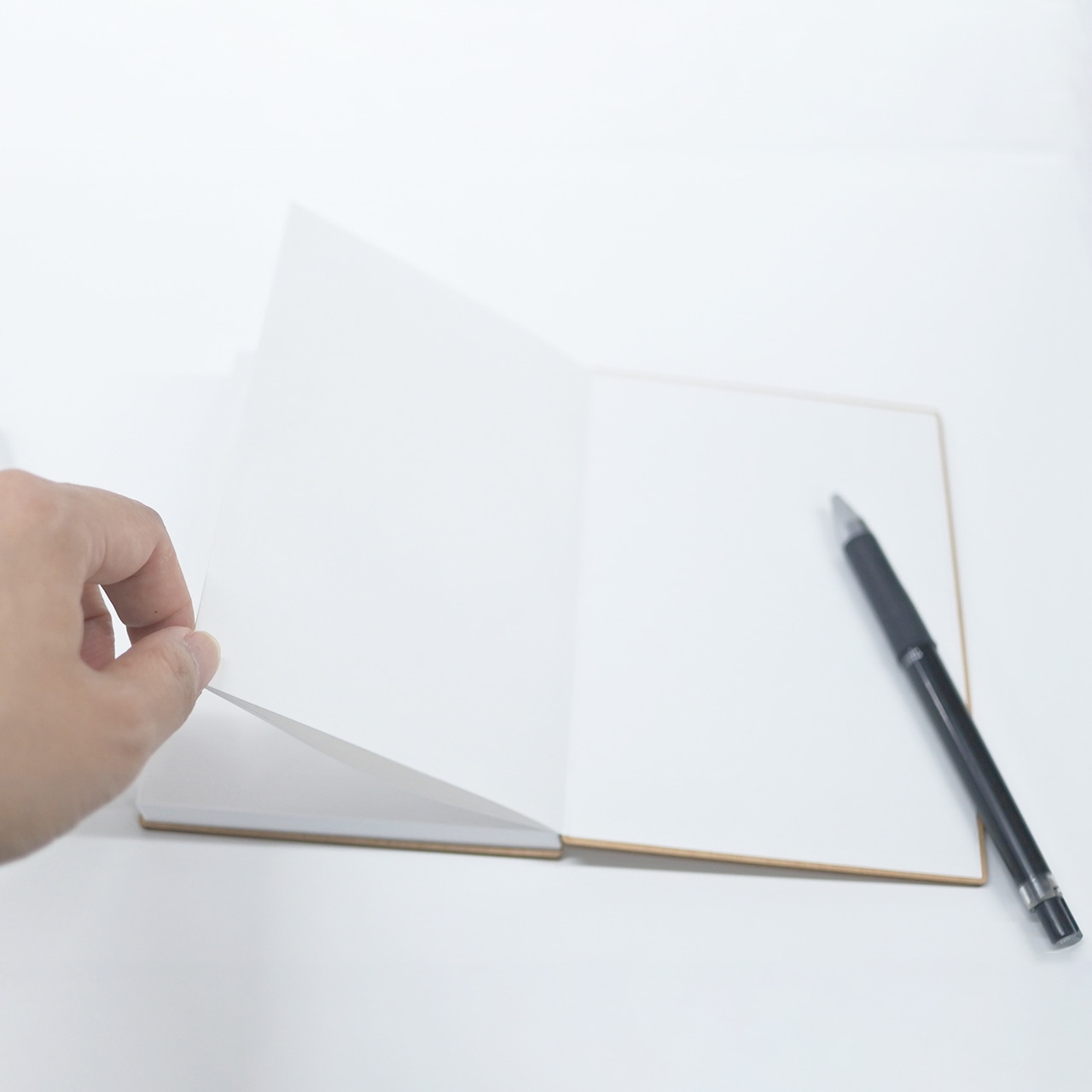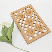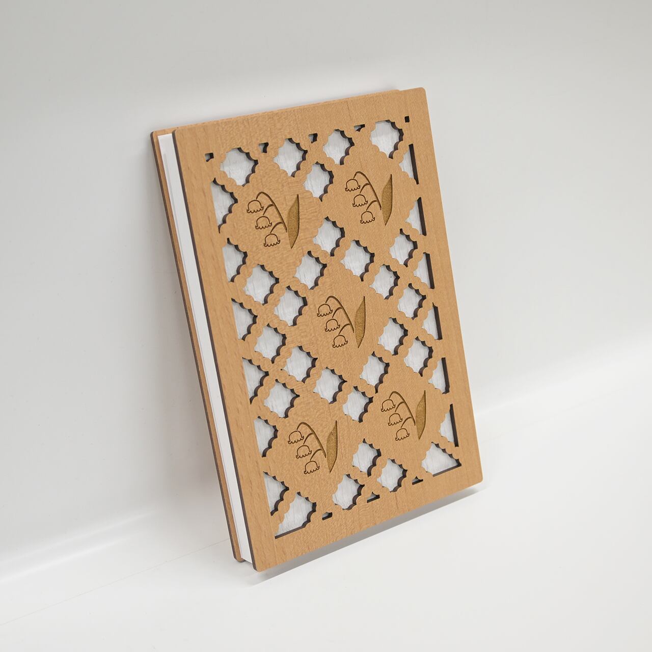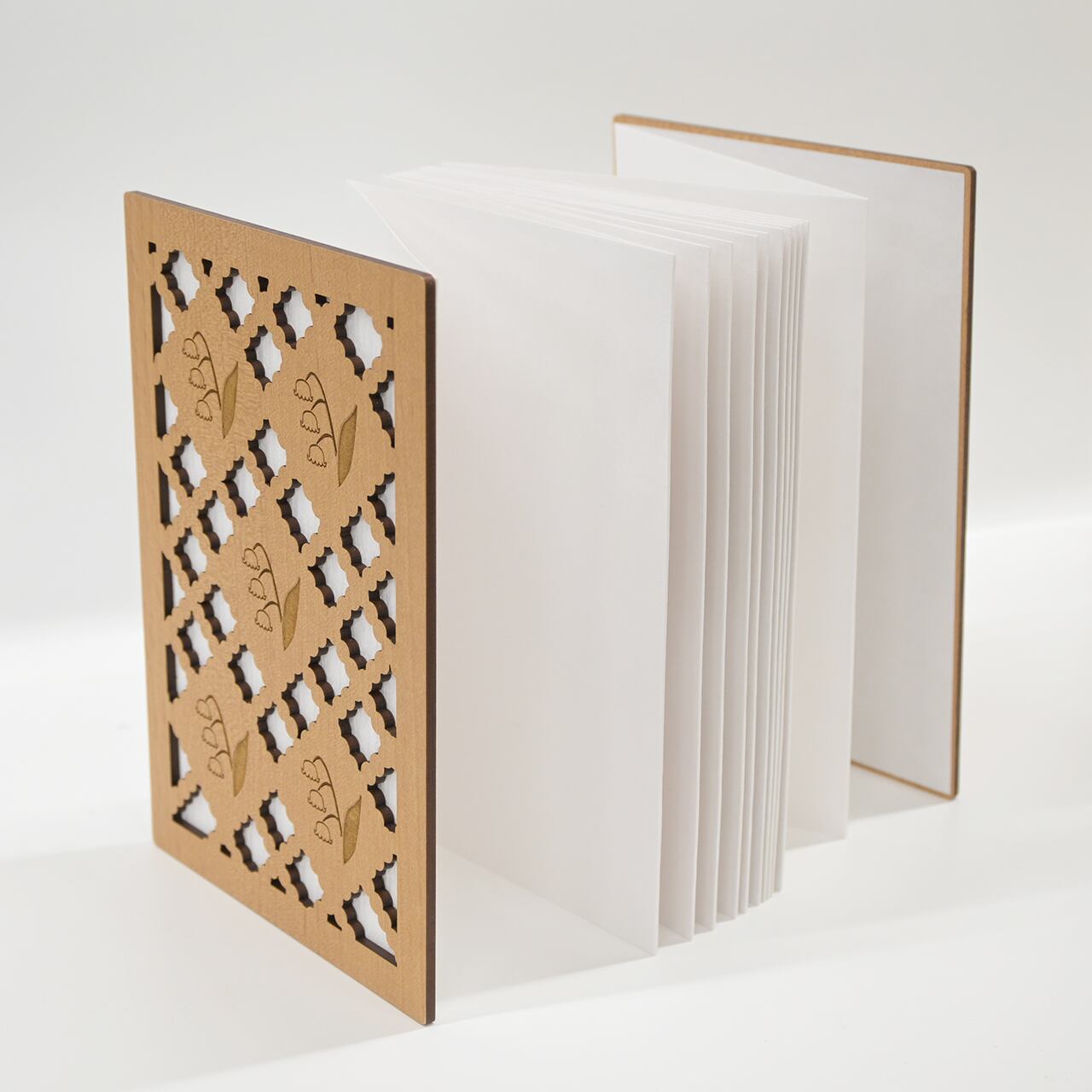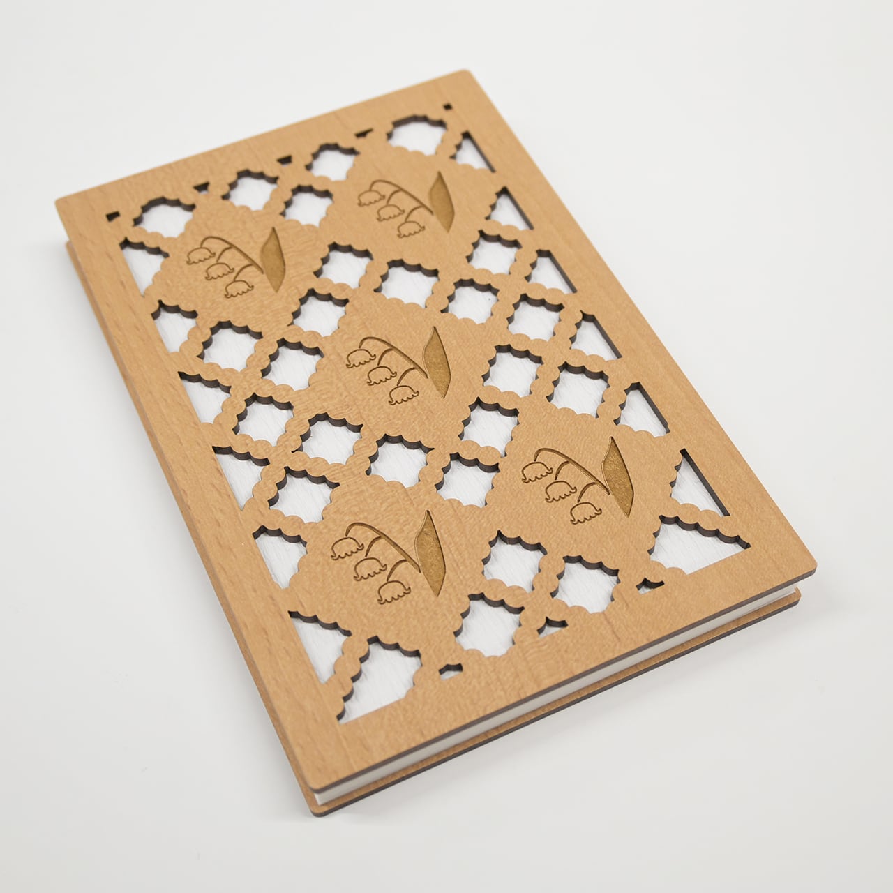 レーザー加工を施した木材(MDF)の表紙は、温もりを感じられる風合いで、手にしっとりと馴染みます。