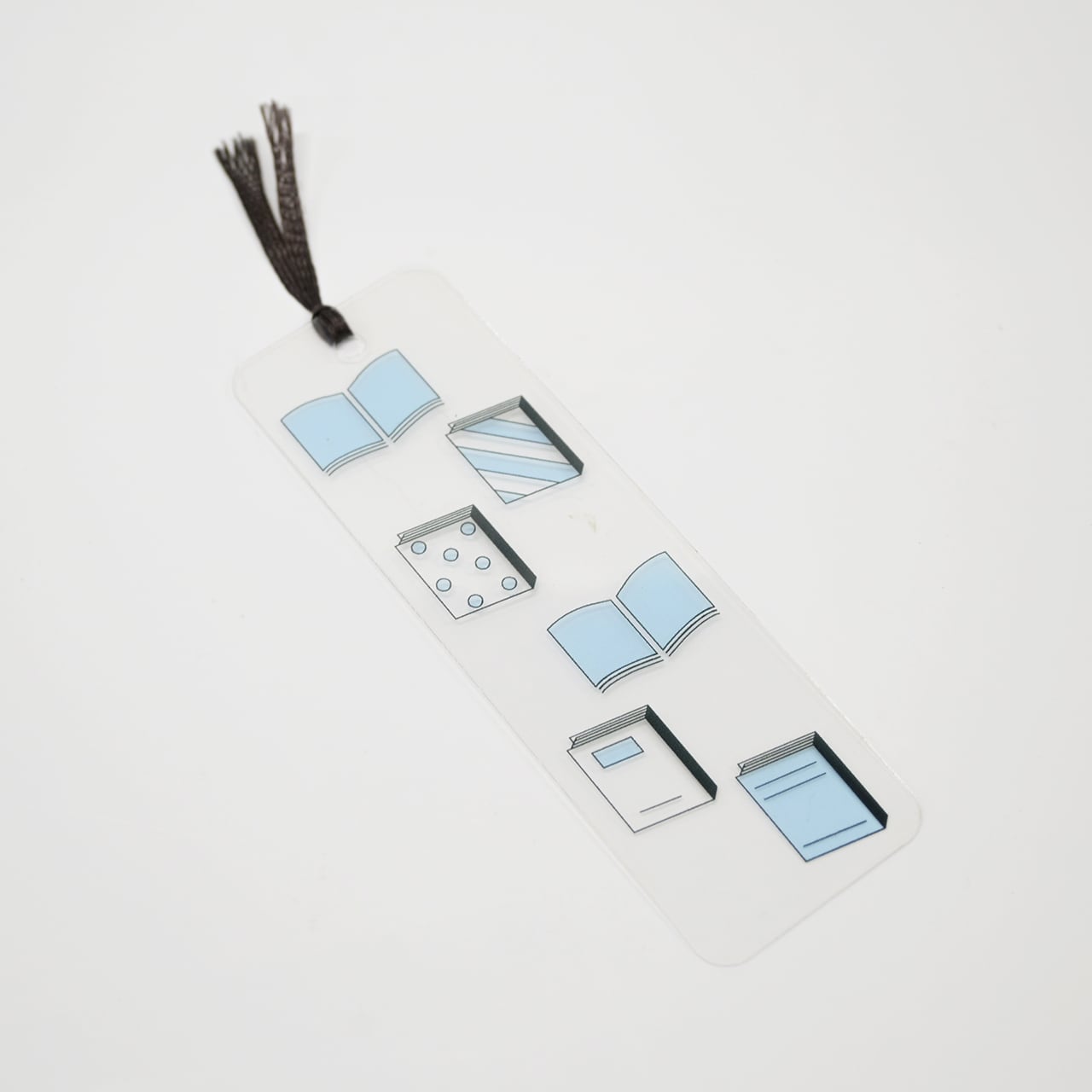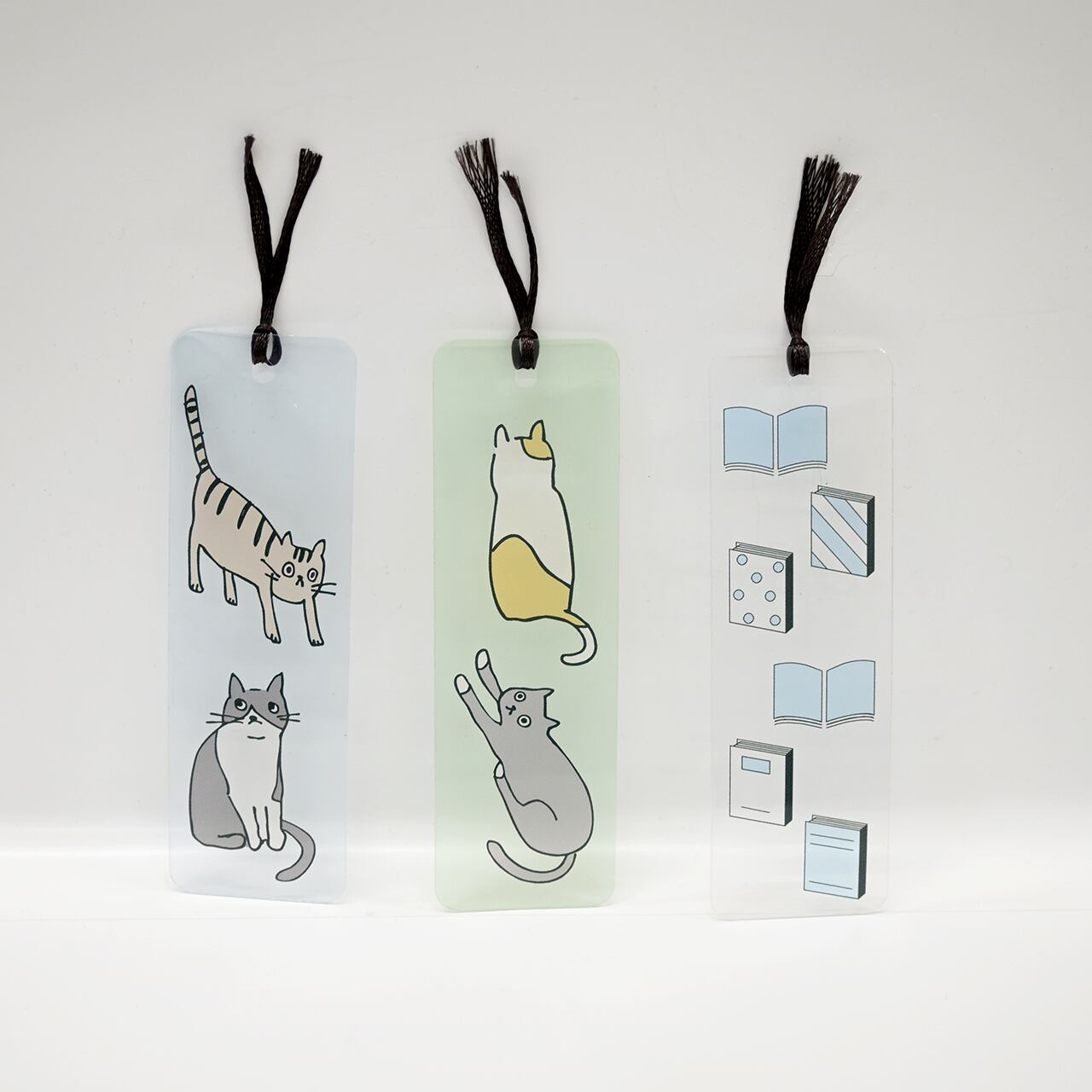 透明フィルムにふんわりカラーで描いた、本のイラストのクリアしおりです。